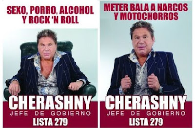 Plagio a Cherashny. Más opositor que nunca, el ex SIDE y otrora candidato a Jefe de Gobierno Porteño, refirió que está harto de que el Gobierno Nacional le copie las ideas. Legalizan el porro, el chupi se vende como si fuera caramelo y encima andan asesinando narcos por la vida, todo eso me jodió tanto que para diferenciarme de Cristina ahora me saqué las tetas.
